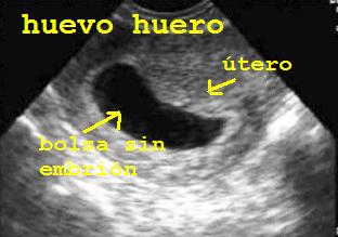 en esta imagen se aprecia una bolsa vacia, sin embrión, es lo que llamamos un "huevo huero" o gestación anenbrionada.